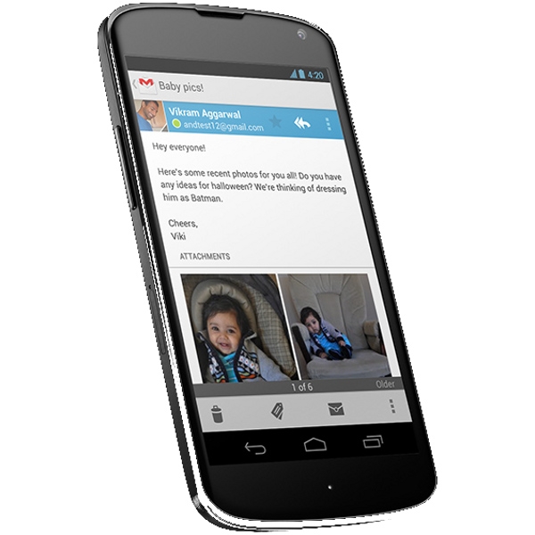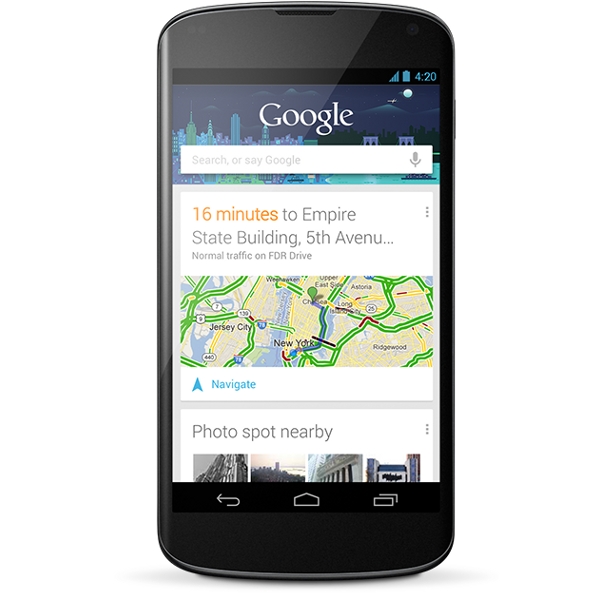 Коммуникатор LG Nexus 4 E960 работает под управлением Android 4.2. Краткие технические характеристики коммуникатора Nexus 4 E960: работа в частотных диапазонах GSM 850/900/1800/1900, UMTS 900/2100, процессор Qualcomm APQ8064 Snapdragon, Adreno 320,Quad-core 1.5 GHz Krait, интерфейсы Wi-Fi 802.11 b/g/n, Bluetooth 4.0, microUSB 2.0, камера 8.0 Мпикс., встроенные чипы GPS с функцией A-GPS.